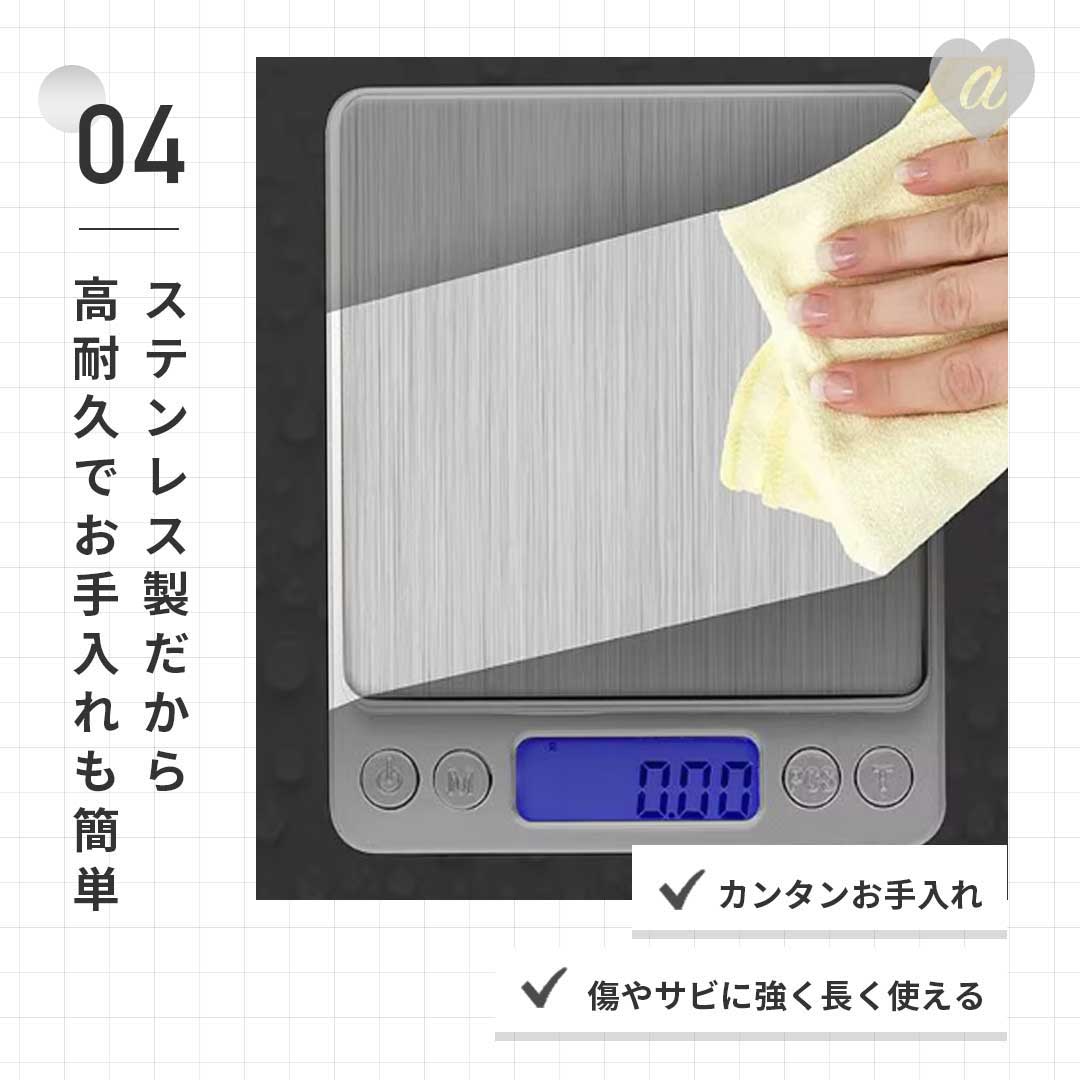 コンパクトで0.01gから500gまで測れます。高感度センサーで、精度が高いデジタルスケールです。コンパクト、収納に便利、使わない時も場所をとりません