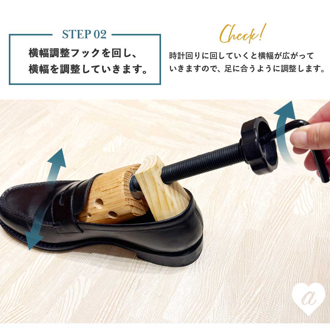 2.ハンドルを回すと、つま先ウッドが左右に広がり、靴のつま先の幅を広げます。