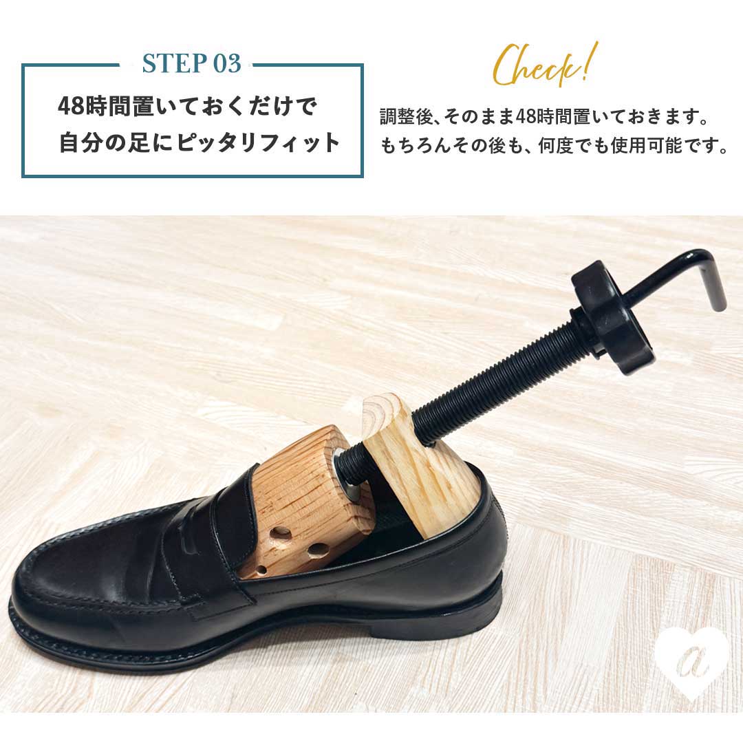 「シューズストレッチャー」はハンドルを回すことで幅を、調節ねじを回すことで長さを調節することができるだけでなく、当たって痛いと感じる場所に部分ストレッチャーを装着することで窮屈な場所をピンポイントに広げることができるため、外反母趾や内反小趾対策にもなります
