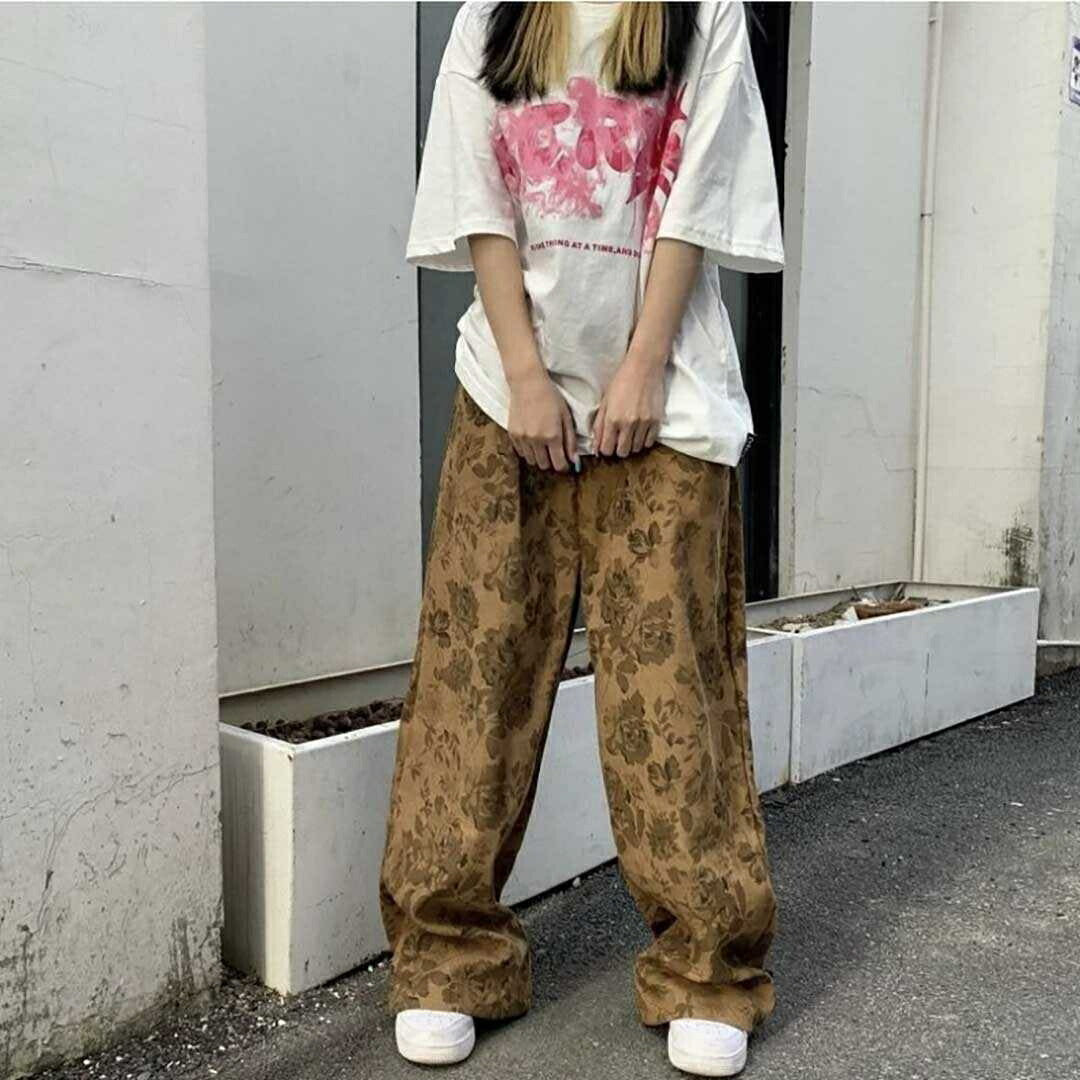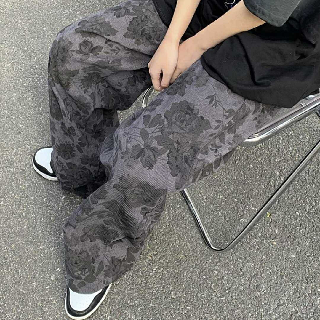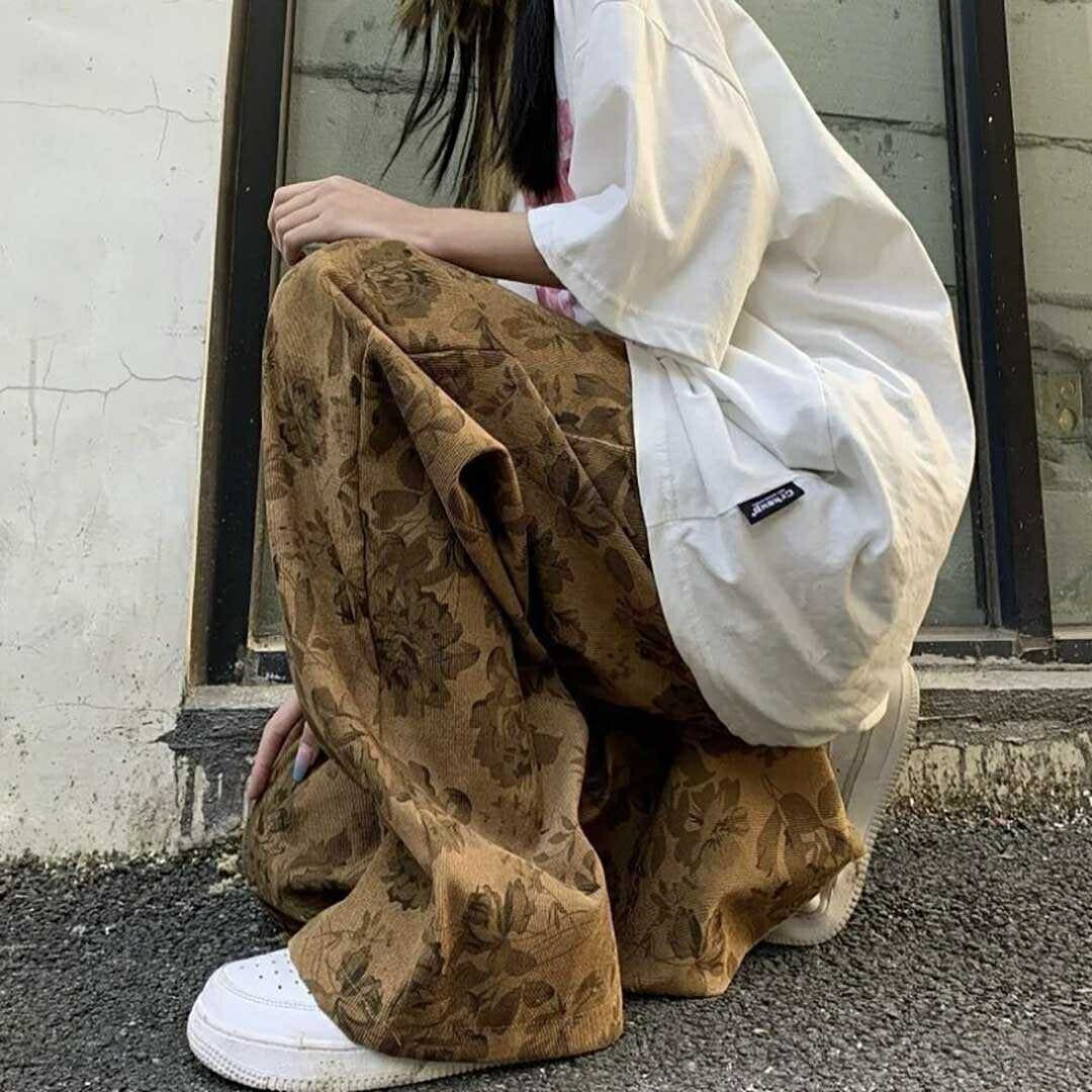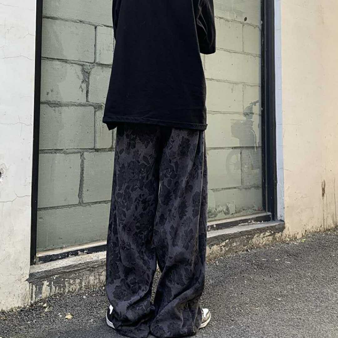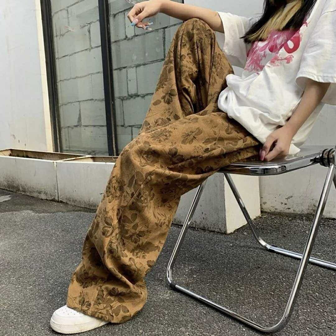 ボトムス 女性 | 花柄ワイドパンツ Lサイズ(ブラック/ブラウン)
