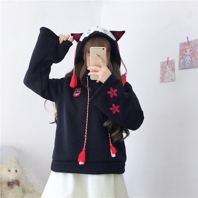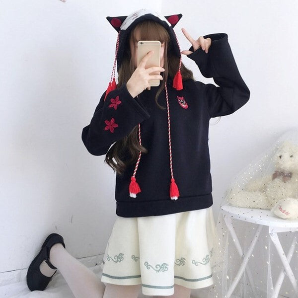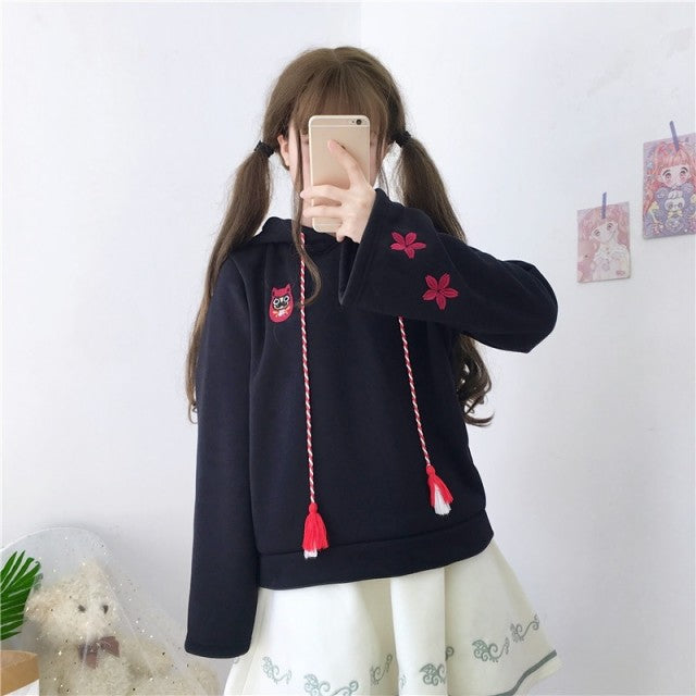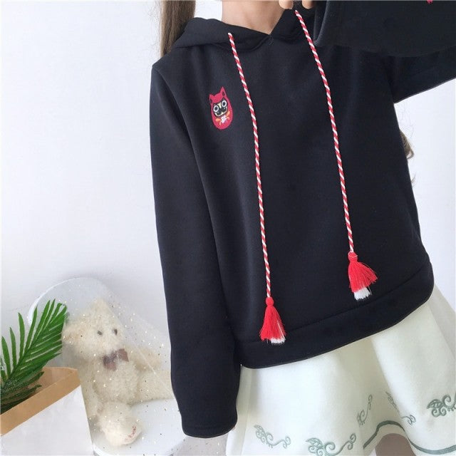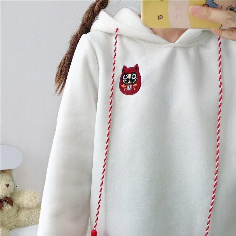 狐フードの耳下から、赤白の編み込まれたヒモが出ているデザイン。胸元にワンポイントのダルマの刺繍がとってもかわいい!