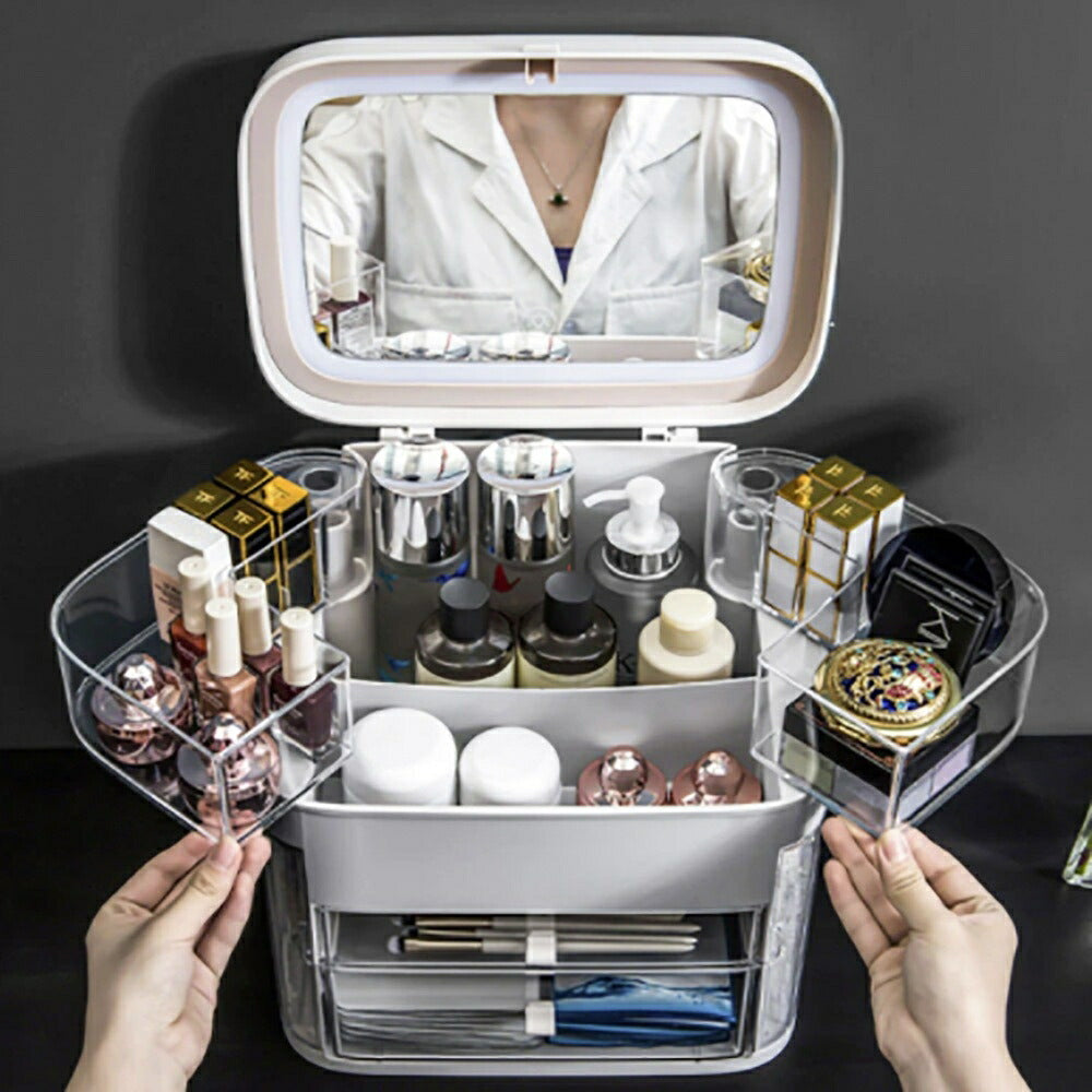 アクセサリーやコスメ、メイク道具を収納できる大容量収納ボックス。太陽光に近い明るさを可能にした高演出色LEDでメイクが楽しくなります。持ち運びもOKな取っ手付き