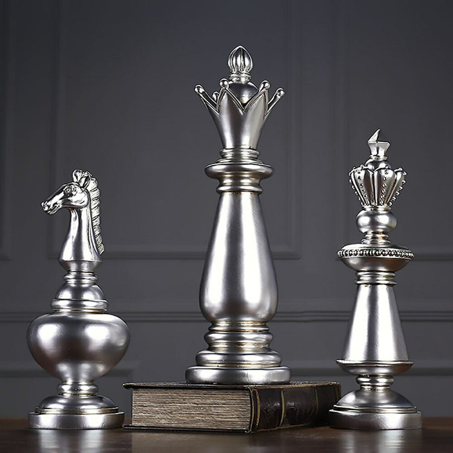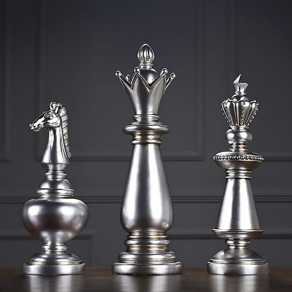 インテリア オブジェ | シルバーメタル製チェス駒3個セット(ナイト・クイーン・キング) 【アンティーク調仕上げ・微細な塗装ムラ等あり】