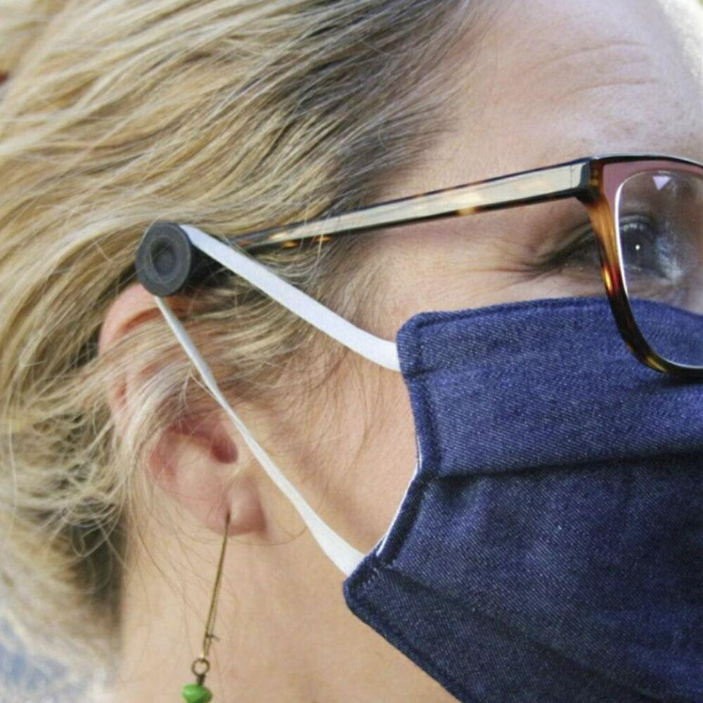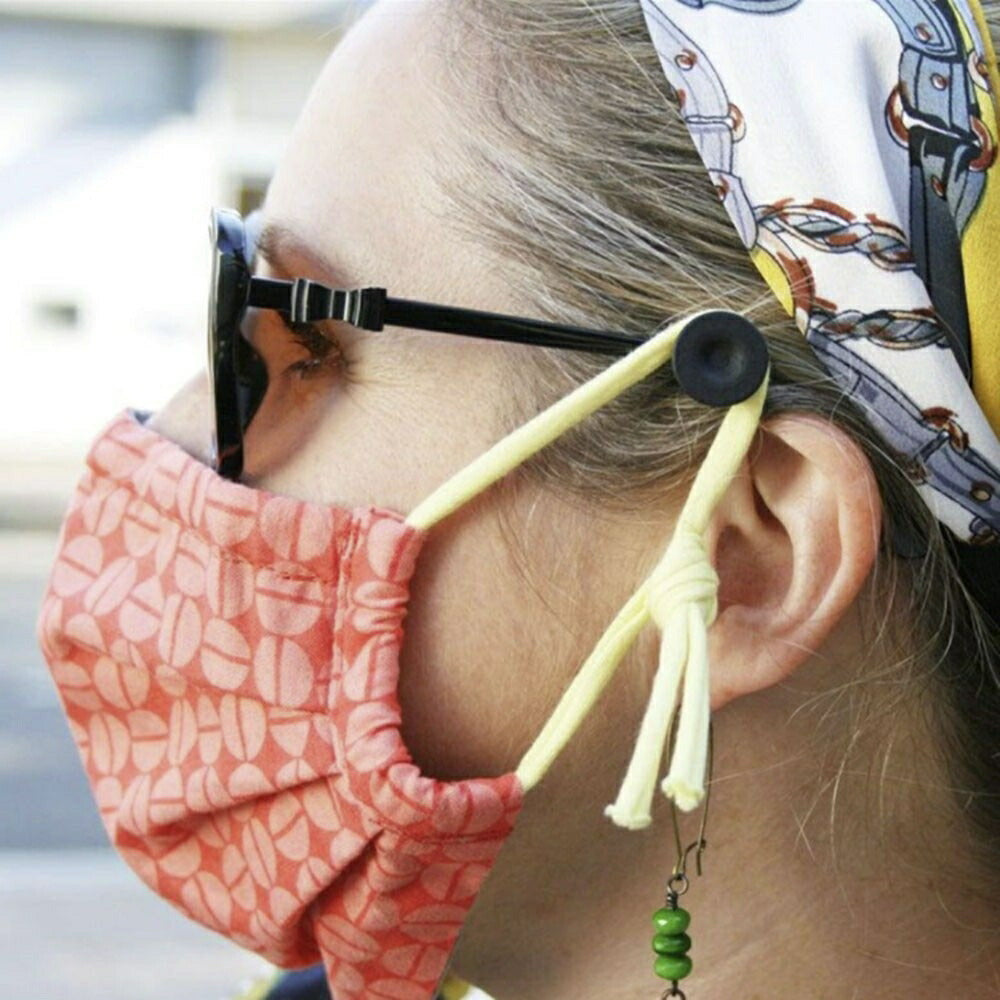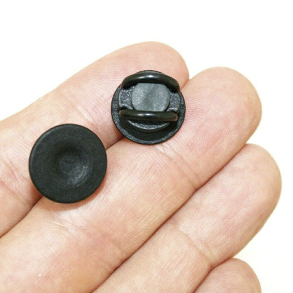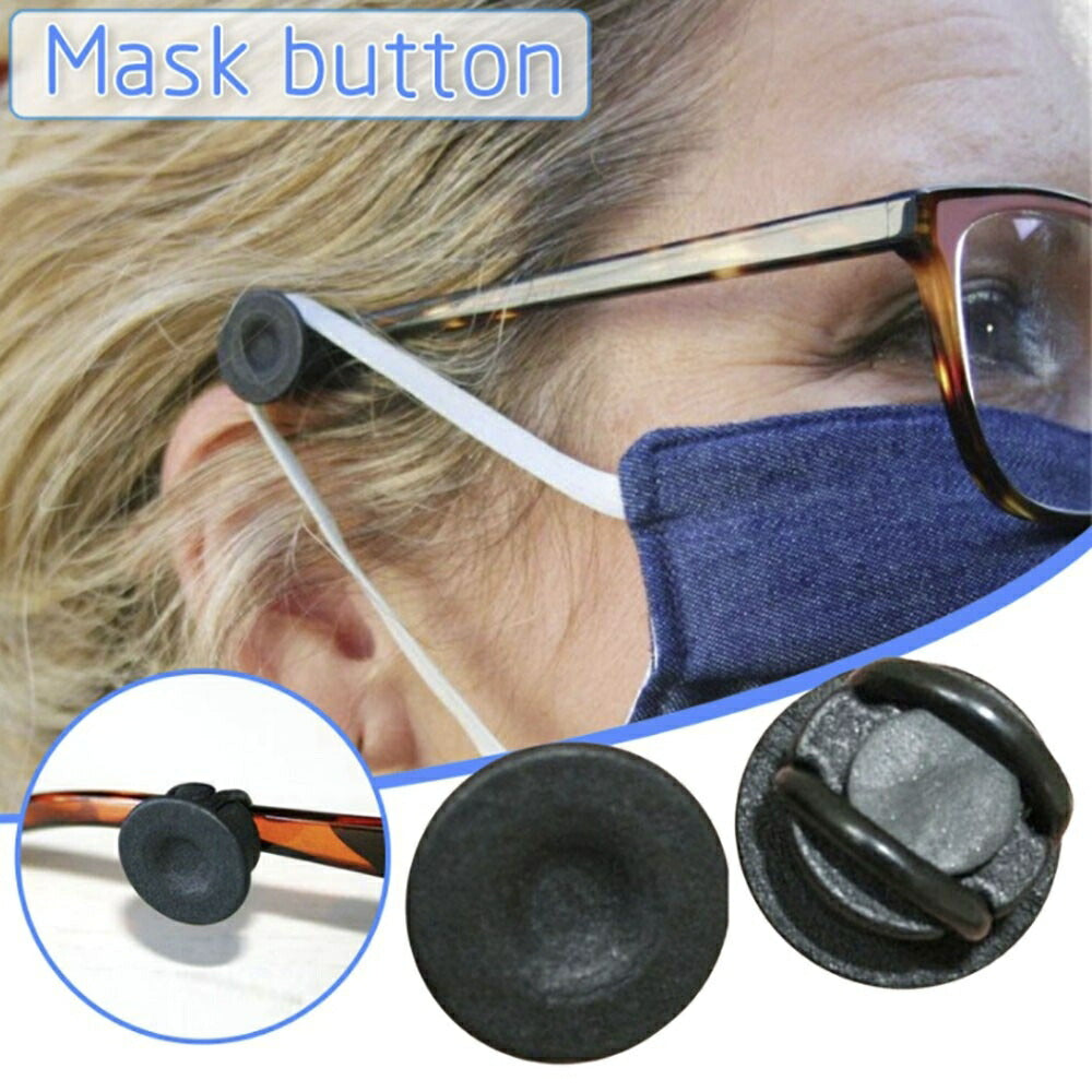 *ボタン状の一番大きな部品をメガネフレームの外側に当て、専用輪ゴムでフレームを挟み込むように固定します。その後ボタン状の部品の真ん中の穴に小さなボタン状の部品をはめ込みます<br>
